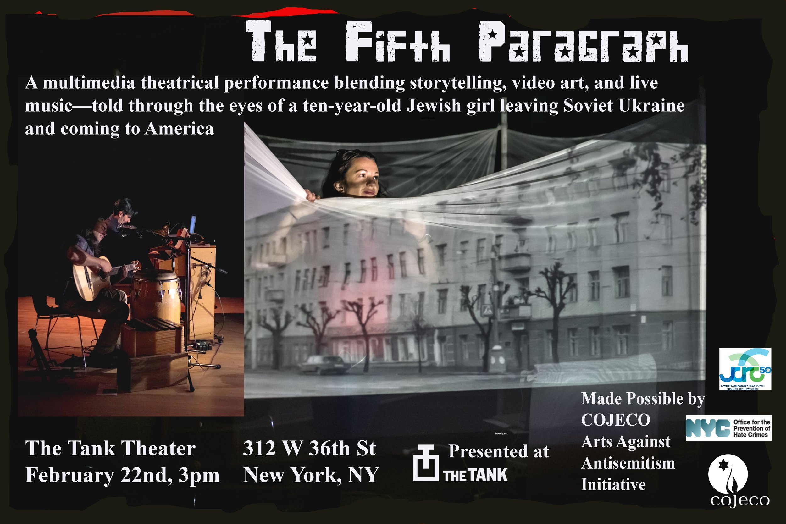 A multimedia performance exploring immigration, antisemitism and escaping Communism, told from the perspective of a ten year-old girl immigrating from the Former Soviet Union. Blending story telling, projected video and live music. The Fifth Paragraph the line in the Soviet passports that identified Jews for the purpose of systemic discrimination. In writing, it is also the conclusive paragraph of a five-paragraph essay.